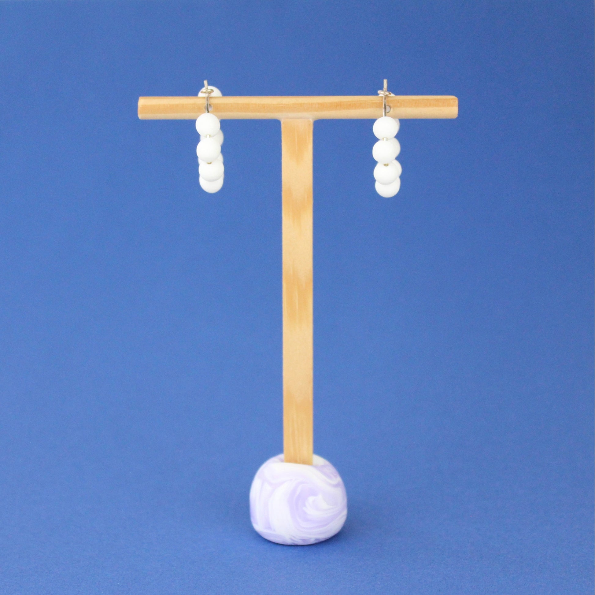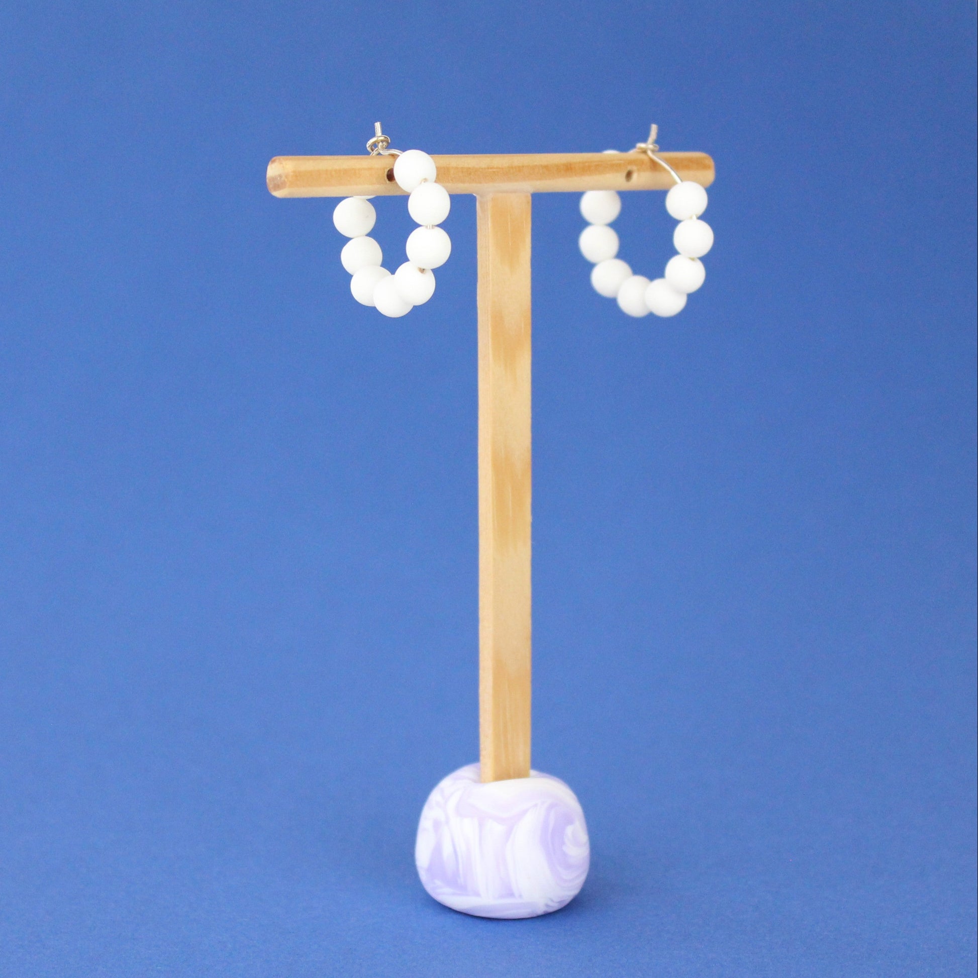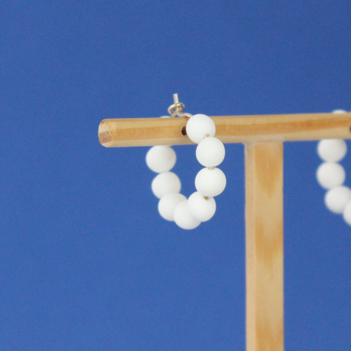 Diese kleinen Creolen bestehen aus handgeformten matten weißen Perlen, aufgereiht auf einer runden Creole. Klassische elegante Perlenästhetik mit einem modernen Twist.
