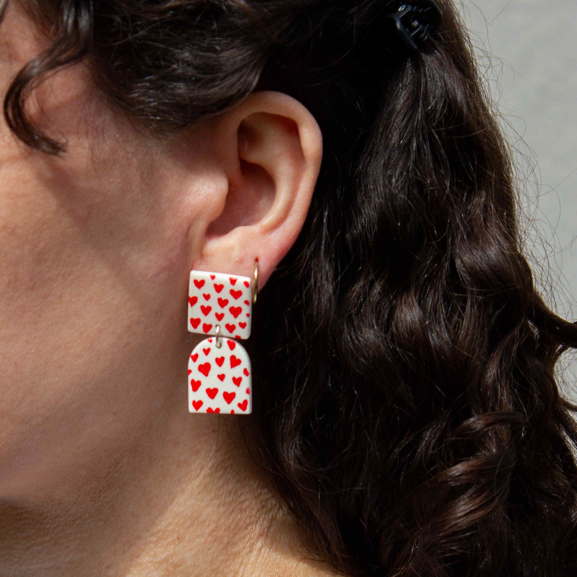 Zweiteilige eckige Ohrringe / weiß mit handbemalten kleinen Herzen / glänzend lackiert