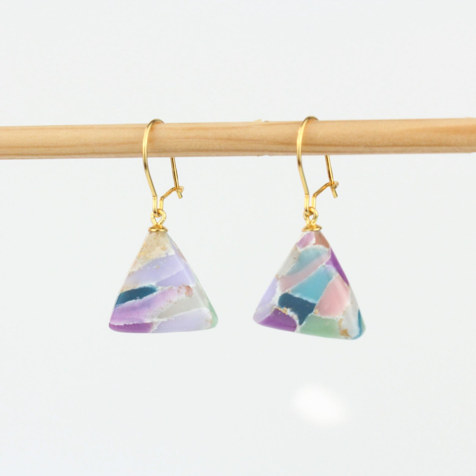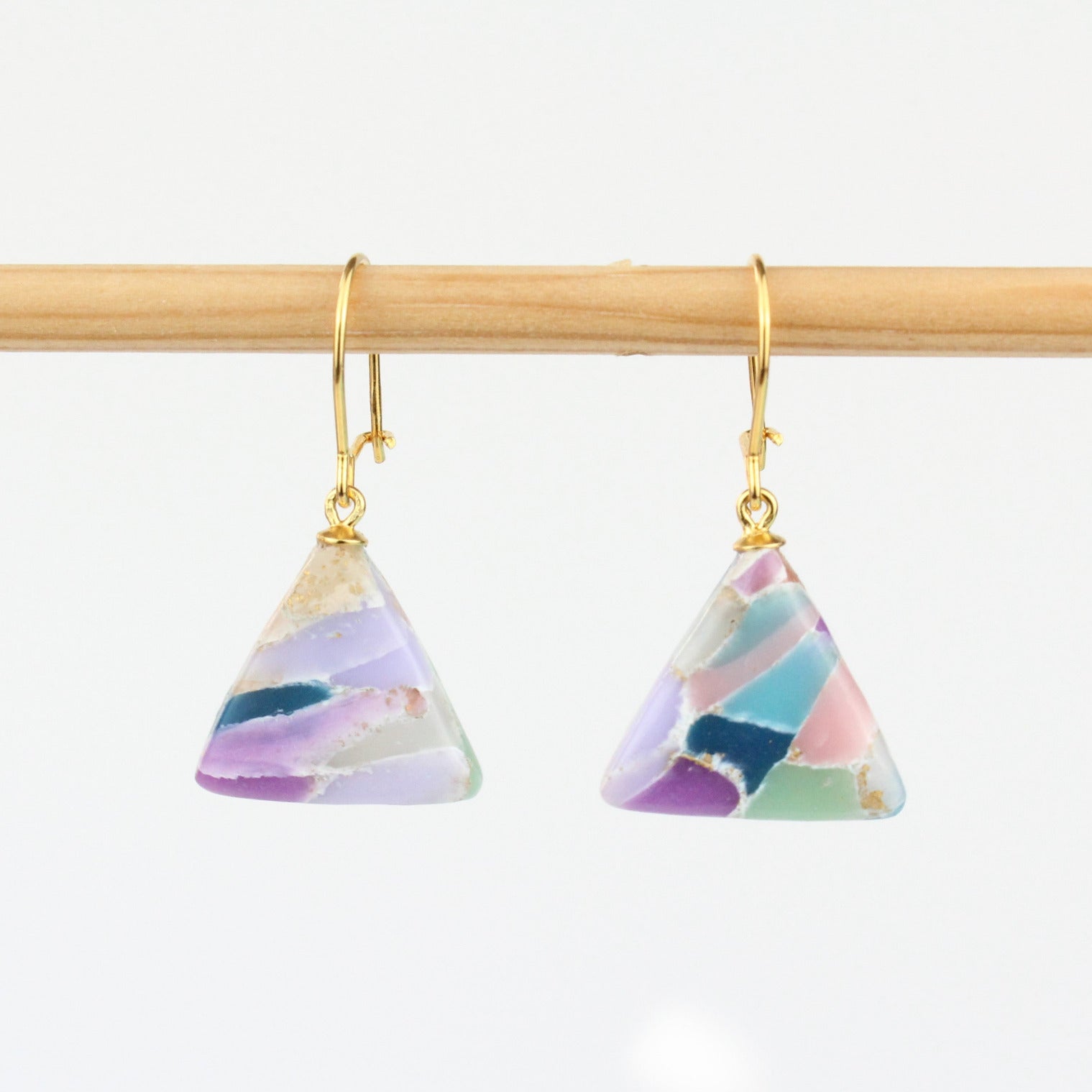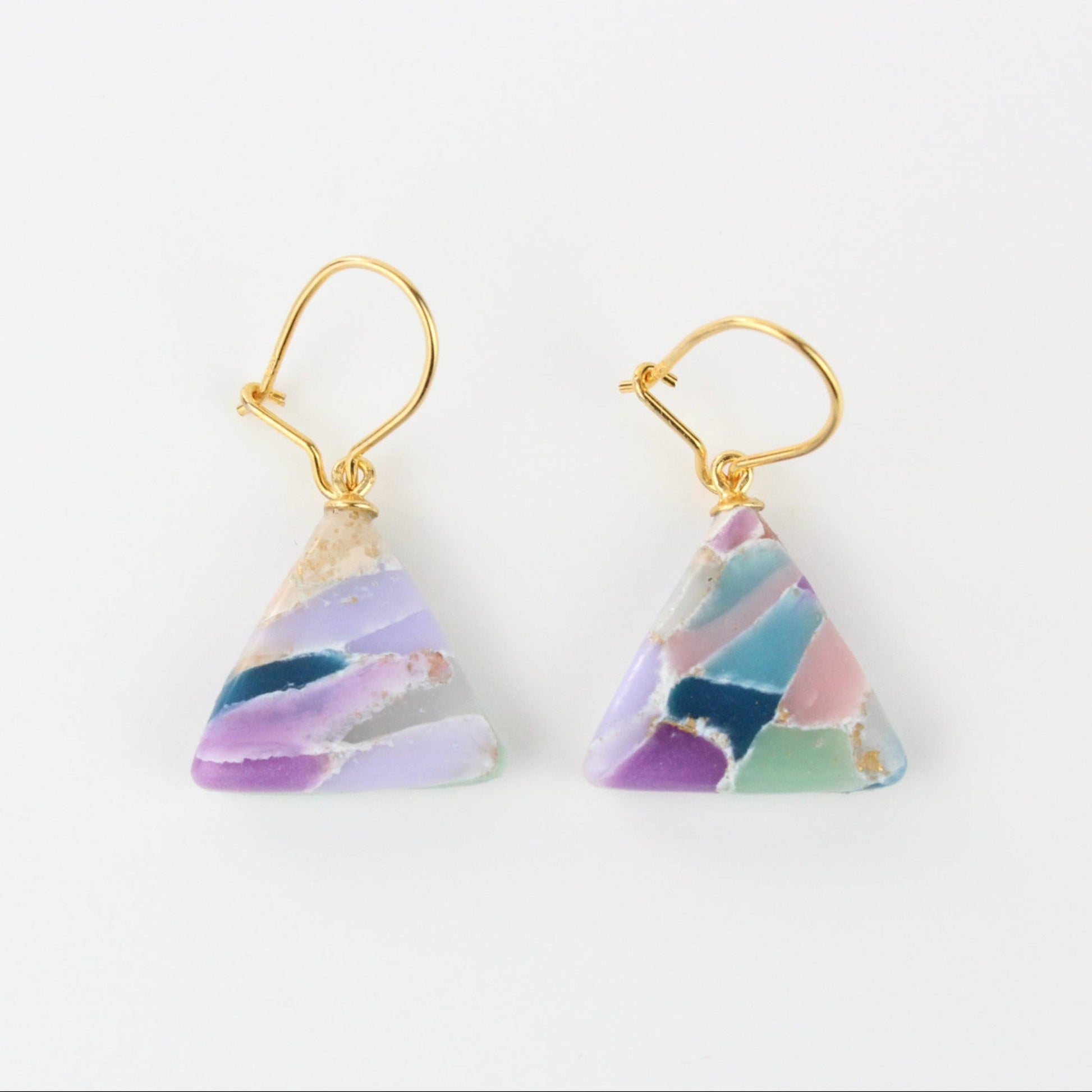 Das kleine Dreieck, das die Ohrringe der Isabella Ohrringe ziert, besteht bei diesem Modell aus verschiedenen transparenten Farben und Blattgold. Jedes Teil ist ein Unikat, ist besonders aufwendig in der Herstellung und wird von einem filigranen Ohrhaken aus vergoldetem Sterlingsilber getragen. Durch das glänzende Finish des Dreiecks kommt das transparente Material besonders gut zur Geltung. Wie alle anderen Ohrringe von ATELIER ANDA sind sie absolut schwerelos und passen zu jedem Outfit.